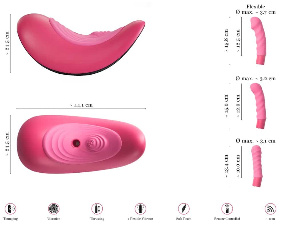 Innovativo vibepad RIDE ON per una cavalcata a mani libere con stimolazione clitoridea pulsante e divertimento vaginale profondo. Passate da un'ondata di piacere all'altra sull'ergonomico dondolo dell'amore. Il vibepad che pulsa intensamente e i 3 penetratori aggiuntivi vi regalano il massimo dell'orgasmo dentro e fuori. Tutto può essere comodamente controllato con il telecomando. Elegante. Confortevole. Preciso.Nell'incavo del dondolo per il sesso in solitaria, ci si siede su un silicone morbido come la seta, le cui dolci ondulazioni trasferiscono perfettamente gli impulsi pulsanti alla vulva e direttamente al clitoride. I 3 diversi accessori in silicone inclusi si inseriscono semplicemente. Ognuno degli stimolatori colpisce per il suo design stimolante e per la sua diversa funzione intensiva: uno spinge, uno vibra e uno coccola con impulsi pulsanti.Nel vibepad rocker e in ogni stimolatore è presente un motore silenzioso e potente. Ciò significa che le singole funzioni possono essere controllate separatamente e combinate in modo eccitante. Direttamente sul vibepad RIDE ON o con il pratico telecomando (portata 10 metri). Il vibepad rocker pulsa sulla vulva e sul clitoride con pulsazioni in 13 modalità. Inoltre, uno degli stimolatori può coccolare la vagina in profondità - 6 modalità di spinta, 7 modalità di vibrazione o picchiettamento in 13 modalità offrono un'ampia gamma di divertimento.Il vibepad RIDE ON è particolarmente facile da usare e intuitivo: con la sua base in silicone antiscivolo, il compatto sex bouncer solitario si appoggia e dondola in modo stabile e sicuro su qualsiasi superficie piana. Per un piacere spensierato e dondolante nel massimo comfort.